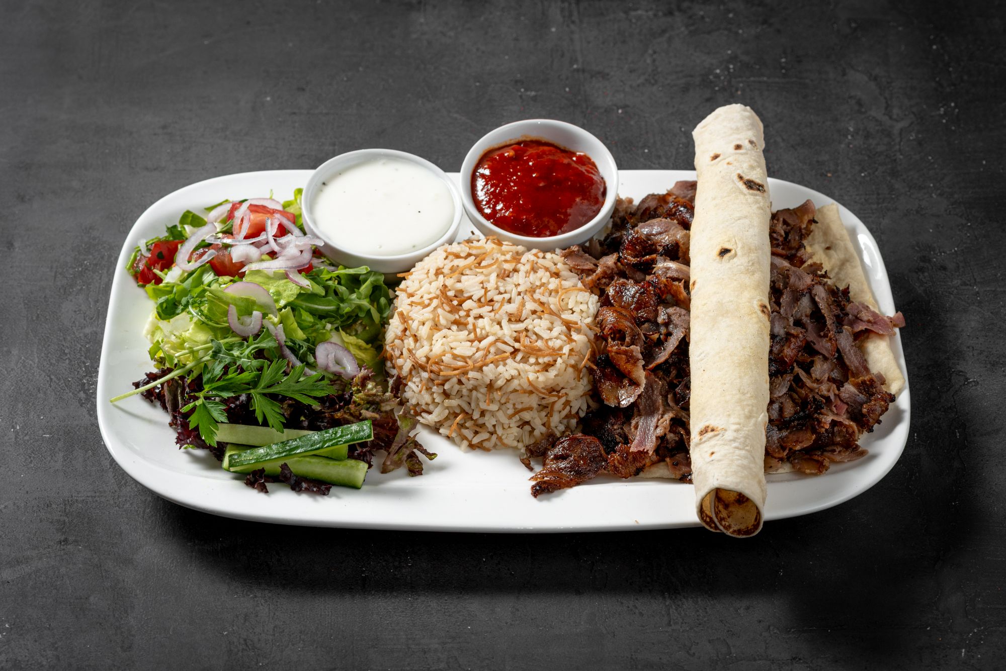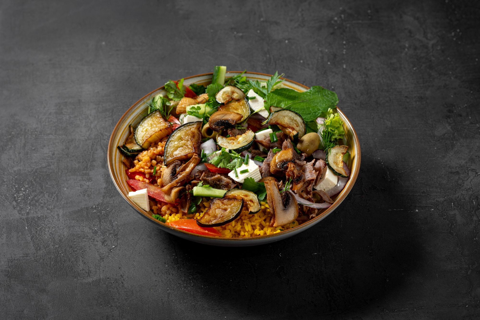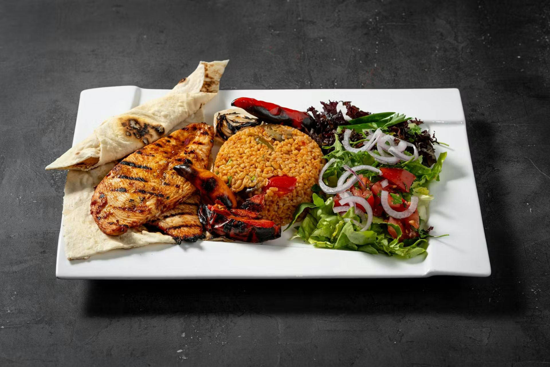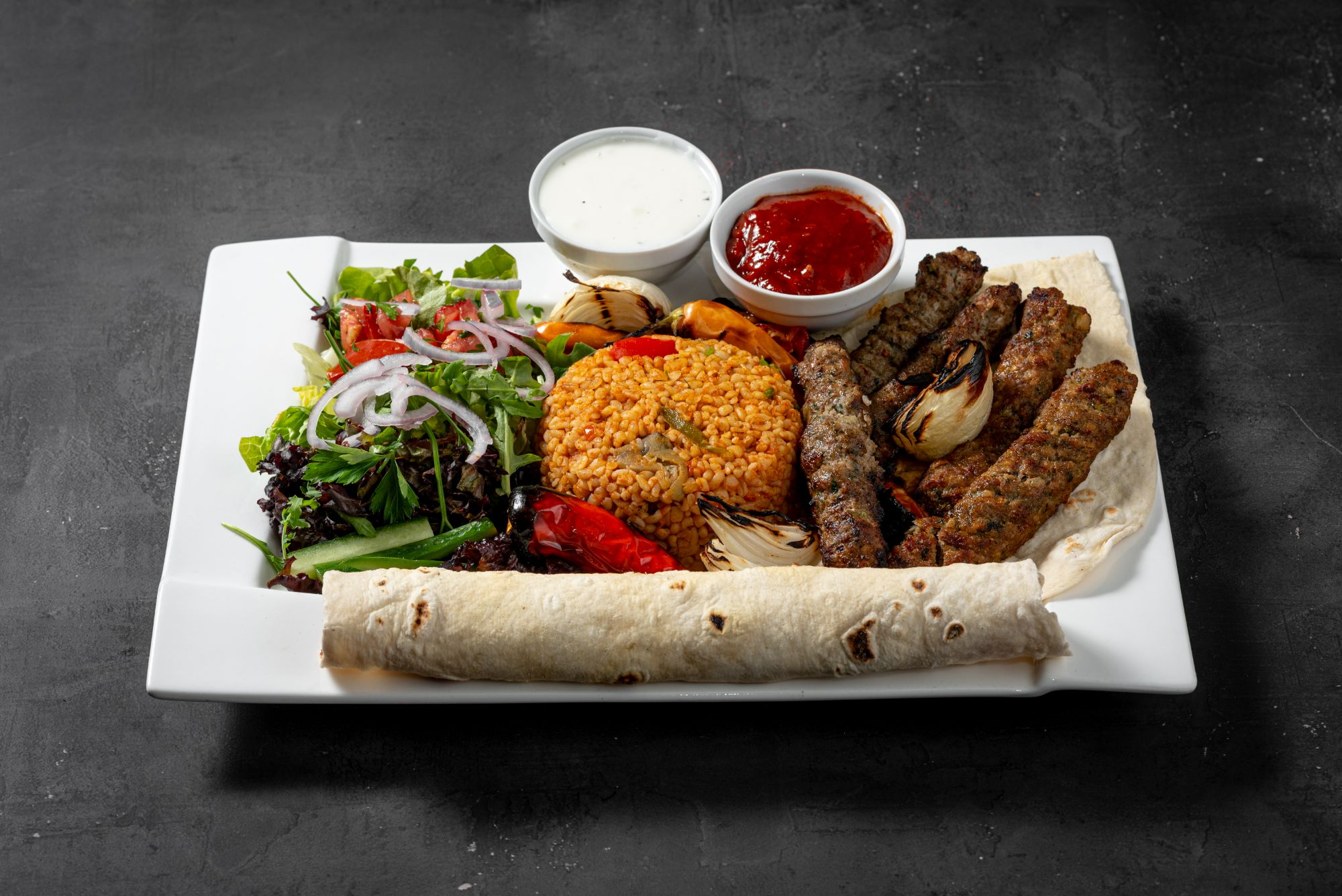 - grillowana sałata - na bazie bakłażana, papryki, pomidorów, cebuli, beyti grill, lavash, hummus, pasta czosnkowa, mutebbel, muhammara, frytki, mix mięs doner,