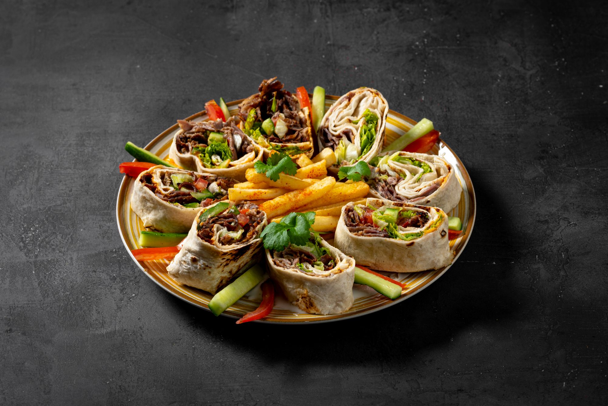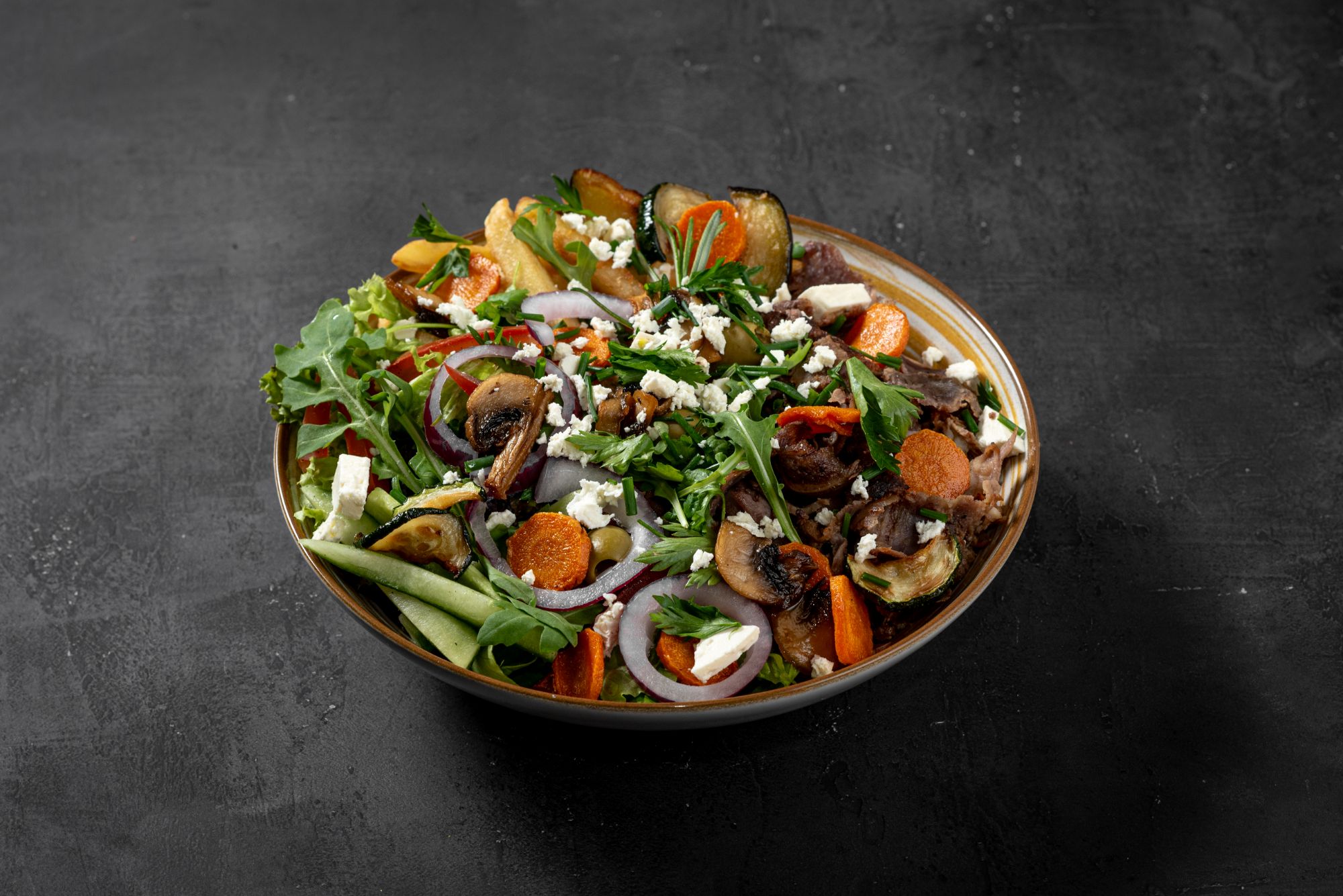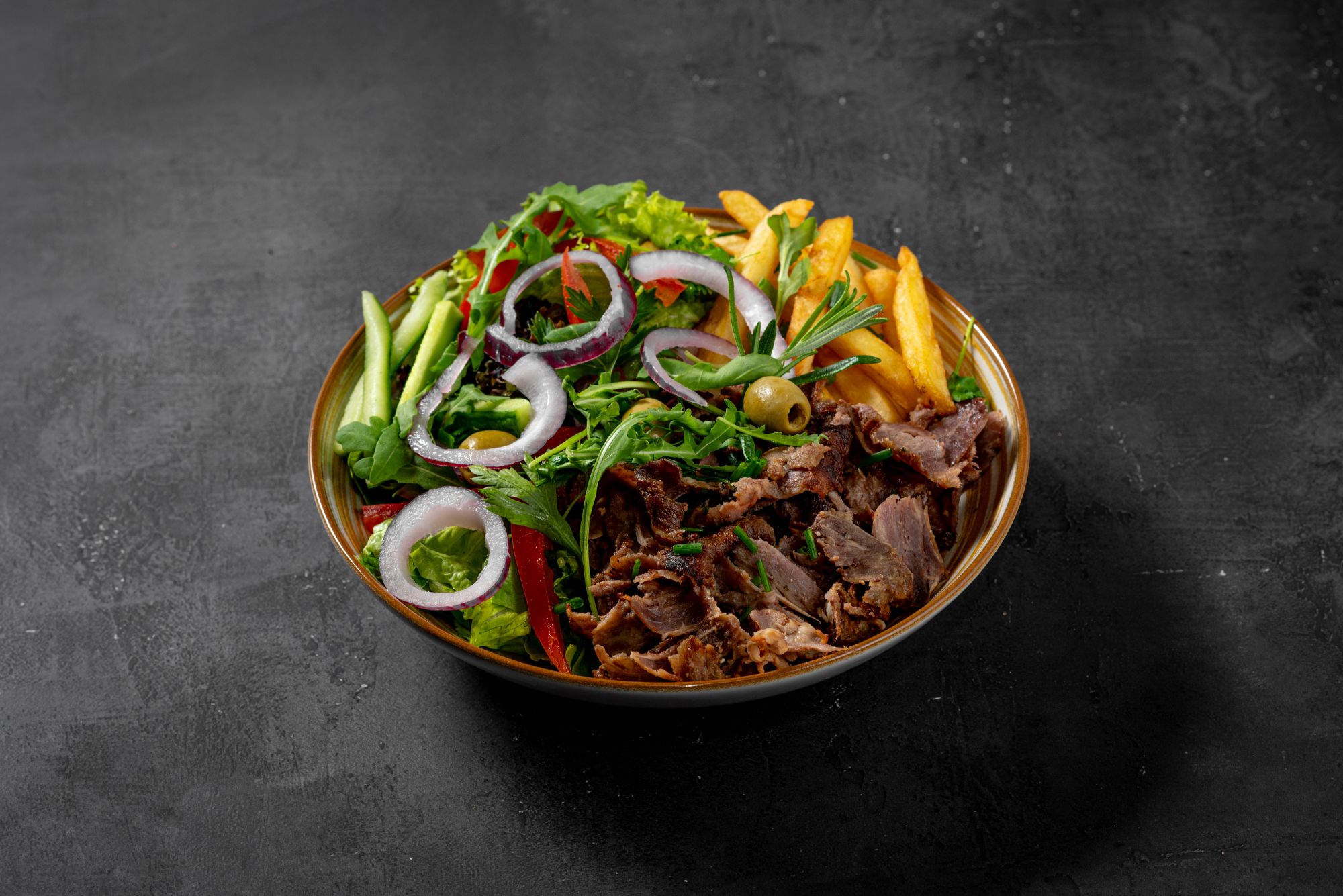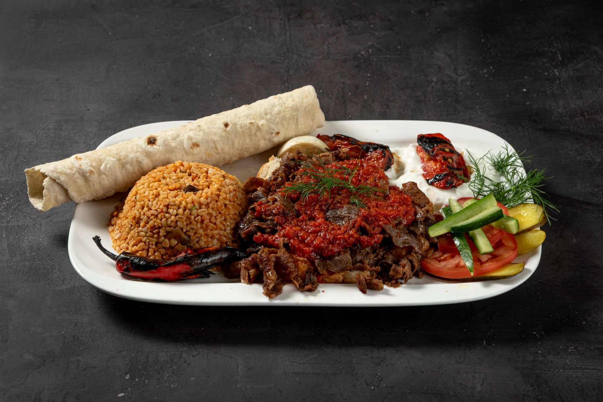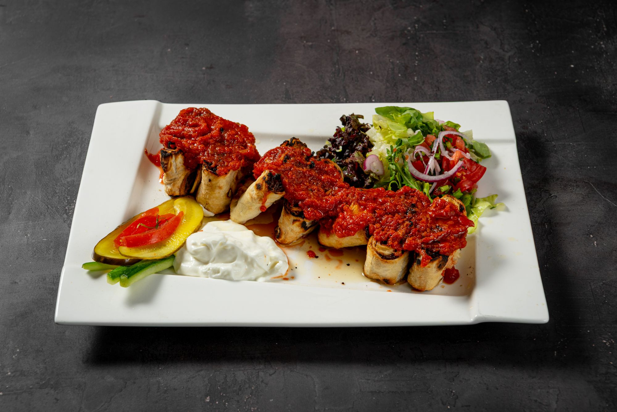 - grillowana sałata - na bazie bakłażana, papryki, pomidorów, cebuli, beyti grill, lavash, hummus, pasta czosnkowa, mutebbel, muhammara, frytki, mix mięs doner,