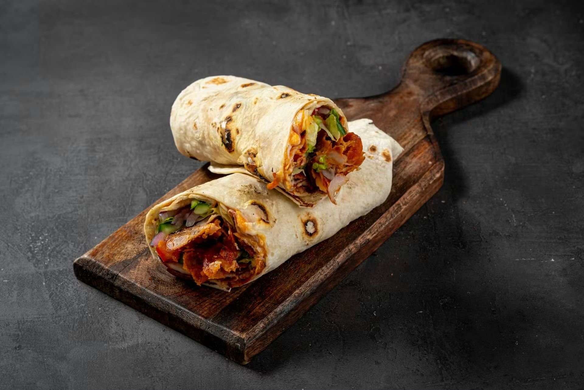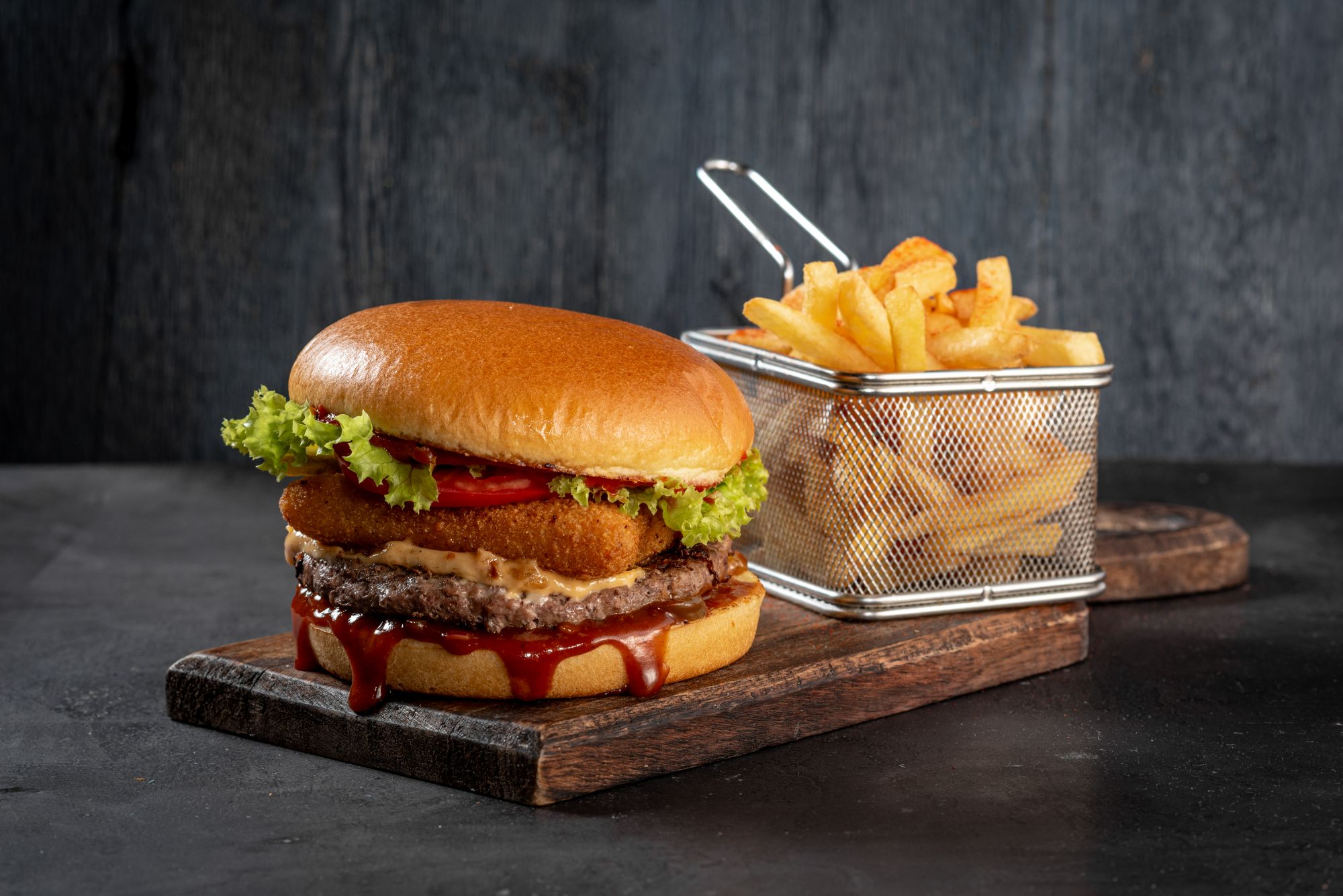 mięso kraft do wyboru: drobiowe / wołowe / mieszane, ser krowi, świeże warzywa okruszone szczypiorkiem, autorski sos do wyboru