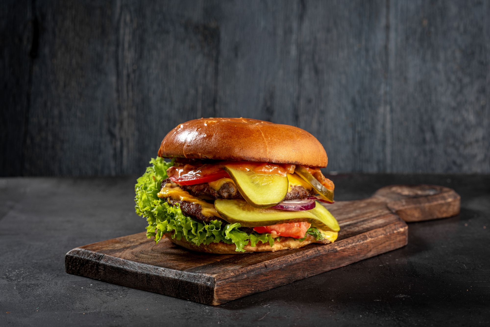 mięso kraft do wyboru: drobiowe / wołowe / mieszane, sałatka, cebula, ogórki, pomidorki, autorski sos do wyboru -